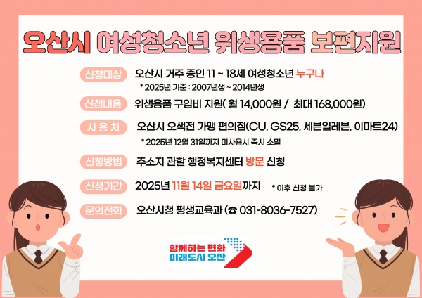 [금요저널] 오산시는 여성청소년의 건강권 보장과 보편적 복지 실현을 위해 올해 처음 시행한 ‘여성청소년 위생용품 보편지원사업’의 신청을 오는 11월 14일 마감한다.