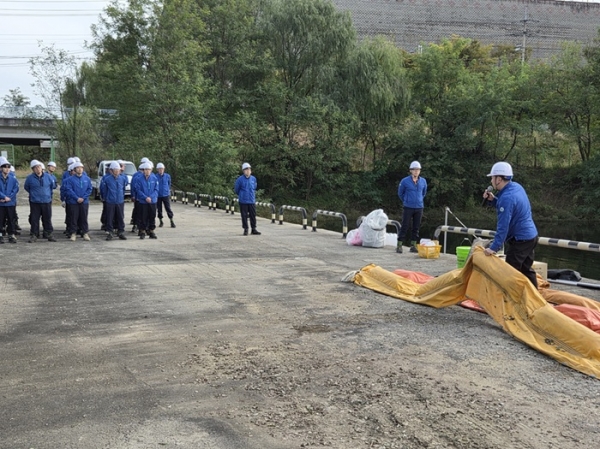 참여자들은 방재 훈련 프로그램에 따라 △사고 상황 보고 및 초동 대응 △고장 설비 정지 및 수계 유입 차단 △기름 차단막 설치 및 흡착포를 활용한 유류 제거 △오염 확산 여부 조사와 시료 채취 등 단계별 절차를 체계적으로 실습했다.