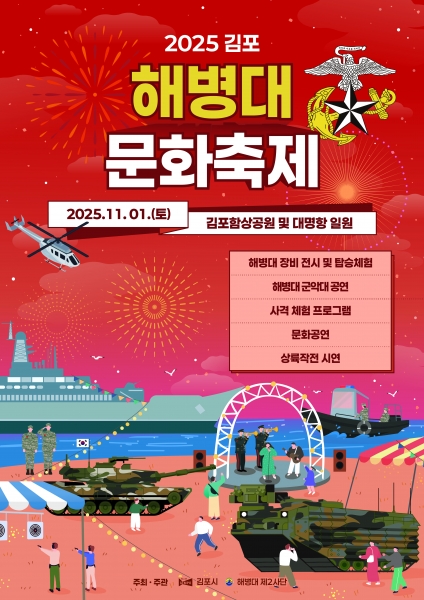 시 관계자는 “올해 김포 해병대 문화축제는 보고 즐기는 것을 넘어, 시민들이 직접 해병대 문화를 경험하고 함께 소통할 수 있는 체험형·참여형 축제로 새롭게 나아갔다”며 “가족, 연인, 친구와 함께 방문해 해병대의 멋진 모습과 짜릿한 체험을 즐기시길 바란다”고 전했다.