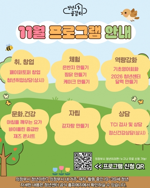 의정부시 청년센터, 개관 4주년 기념 11월 특별 프로그램 참여자 모집