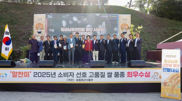 명인 선발은 벼 재배 현장 평가와 백미 품위, 외관 성분, 식감 기계 분석 등 종합 심사를 거쳐 마장면 김동리 농업인이 ‘2025년 임금님표이천쌀 명인’ 으로 선정됐으며 금상 이상윤, 은상 이병일 동상 원종고 한양희 농업인이 각각 수상의 영예를 안았다.