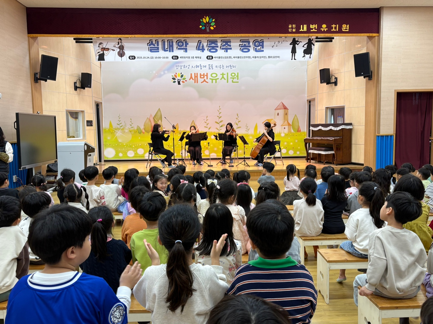 □ 예천군 호명읍 새벗유치원(원장 우수경)은 10월 24일(금)에 3층 체육실에서 유아 122명을 대상으로 실내악 4중주 공연을 개최했다.