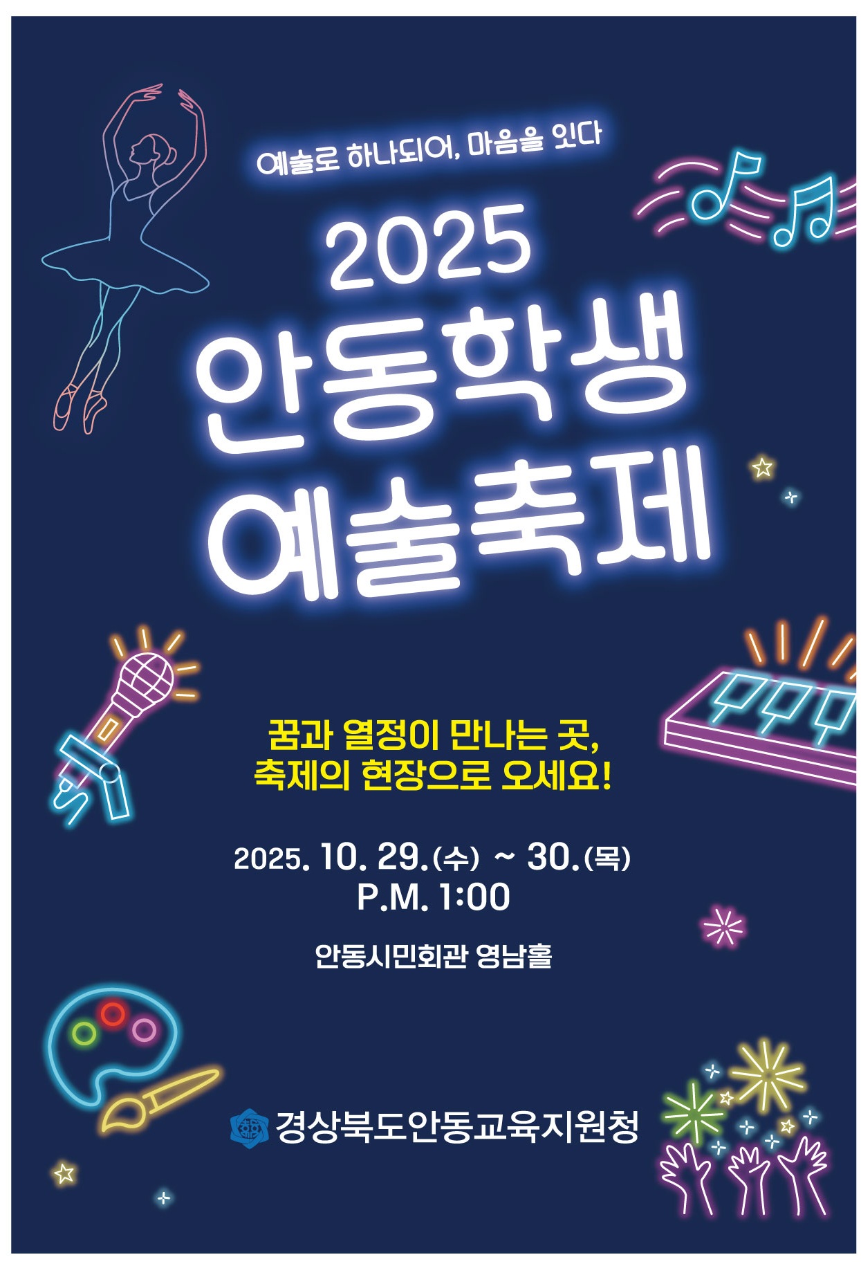 학생, 교사, 학부모가 함께하는 《2025 안동학생예술축제》를 개최할 예정이다. 이번 축제는‘예술로 하나되어, 마음을 잇다’를 주제로,