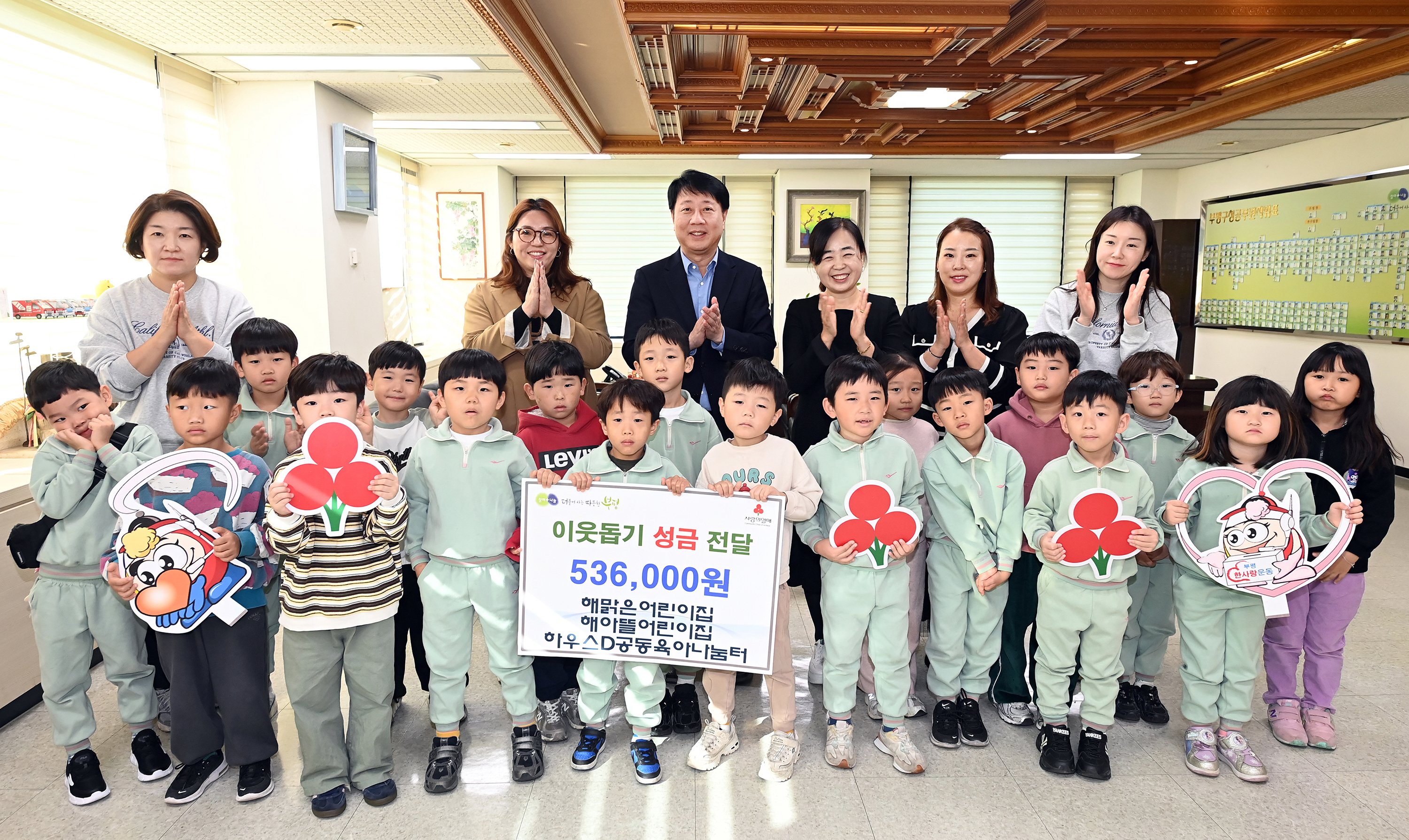 [금요저널] 부평구(구청장 차준택)는 27일 해맑은어린이집·해아뜰어린이집·하우스D공동육아나눔터가 함께 모은 이웃돕기 성금 53만6천원을 전달받았다.