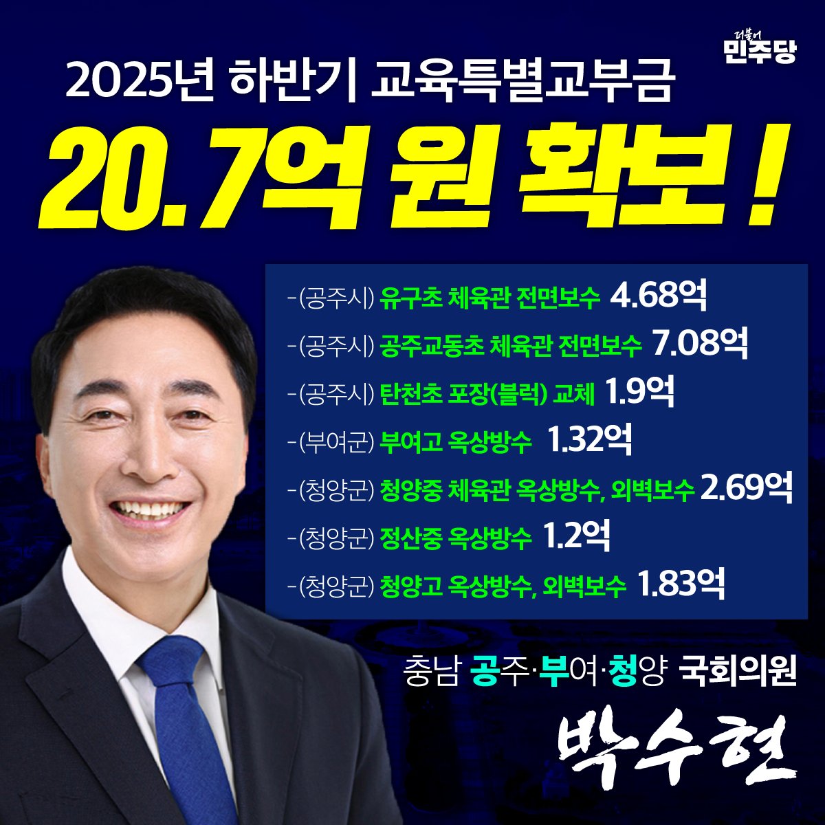 박수현 의원은 "아이들이 지역에 상관없이 안전한 학교에서 배우는 것, 그리고 교육환경 격차를 줄이는 일은 국가의 기본 책무"라며 "공주시·부여군·청양군교육지원청과 학교 관계자 여러분들의 노력 덕분에 현장에서 꼭 필요한 곳에 예산을 지원할 수 있게 됐다"고 밝혔다.
