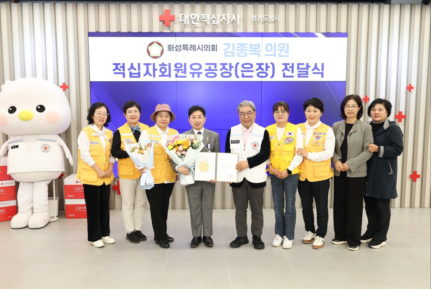 [금요저널] 화성특례시의회 문화복지위원회 김종복 의원(동탄4·5·6동)이 28일 대한적십자사 경기도지사(회장 이재정) 남중부봉사관에서 ‘대한적십자사 회원유공장 은장’을 수상했다.