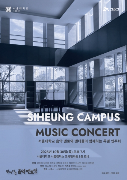 [금요저널] 서울대학교 시흥캠퍼스와 시흥시가 협력하는 ‘서울대학교 음악 멘토-멘티 특별 연주회’ 가 10월 30일 오후 7시, 서울대학교 시흥캠퍼스 교육협력동 1층 로비에서 열린다.