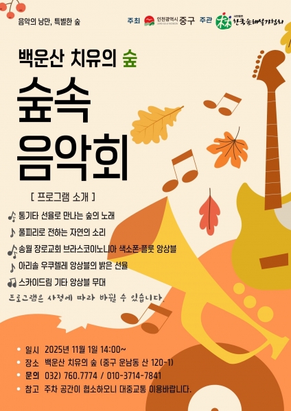 이번 음악회는 인천 중구가 ‘2025년 산림치유 프로그램 운영 사업’의 일환으로 올해 처음 선보이는 행사다.