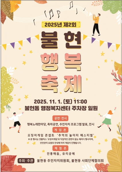 불현동 주민자치위원회는 오는 11월 1일 불현동 행정복지센터 주차장 및 인근 도로 일원에서 제2회 불현행복축제를 개최한다고 밝혔다.