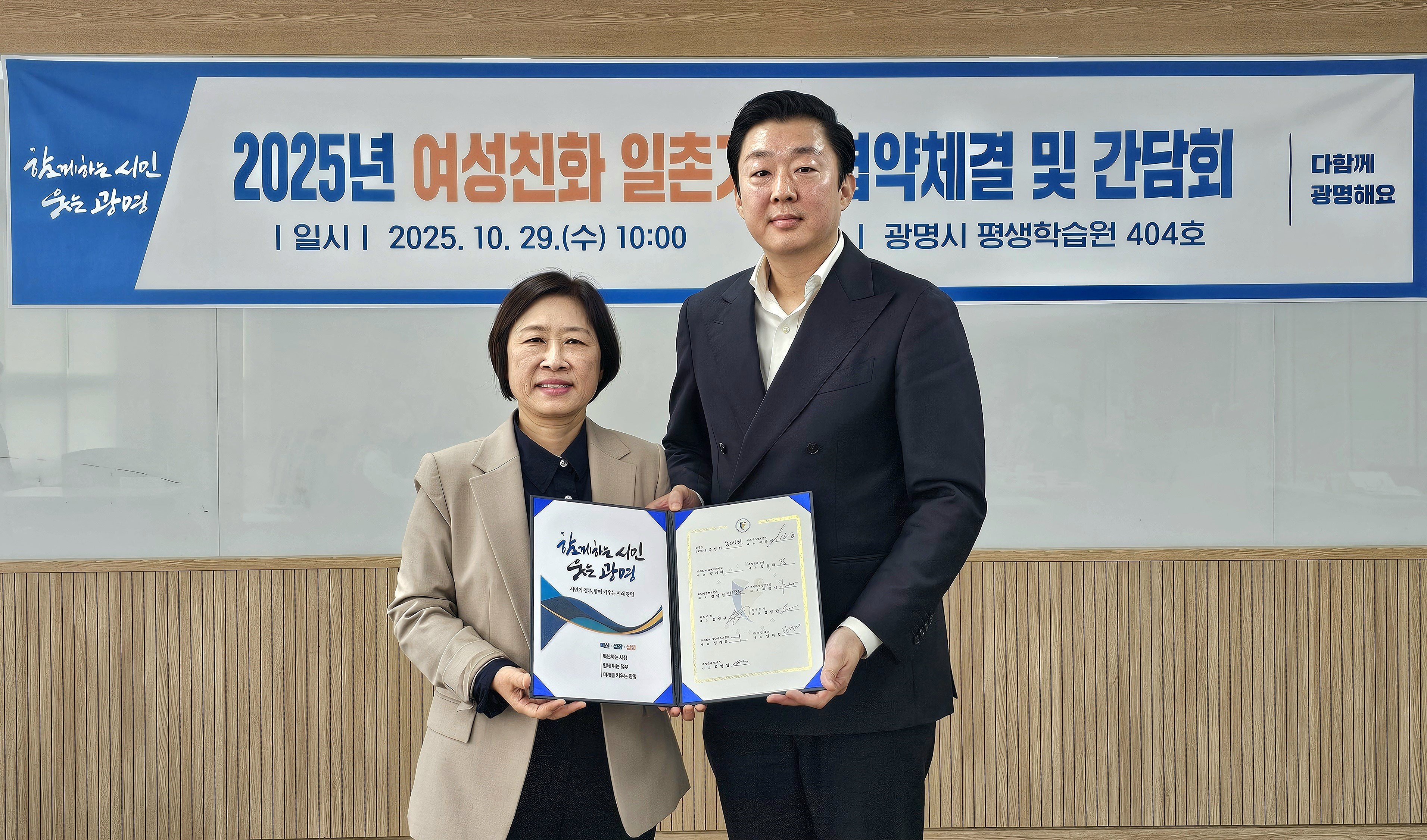 시는 29일 광명시평생학습원에서 ㈜베니스에프앤비 등 15개 기업과 함께 ‘2025년 여성친화 일촌기업 협약식 및 간담회’를 열고 여성의 경제활동 확대와 일·가정 양립이 가능한 기업문화 조성을 약속했다.