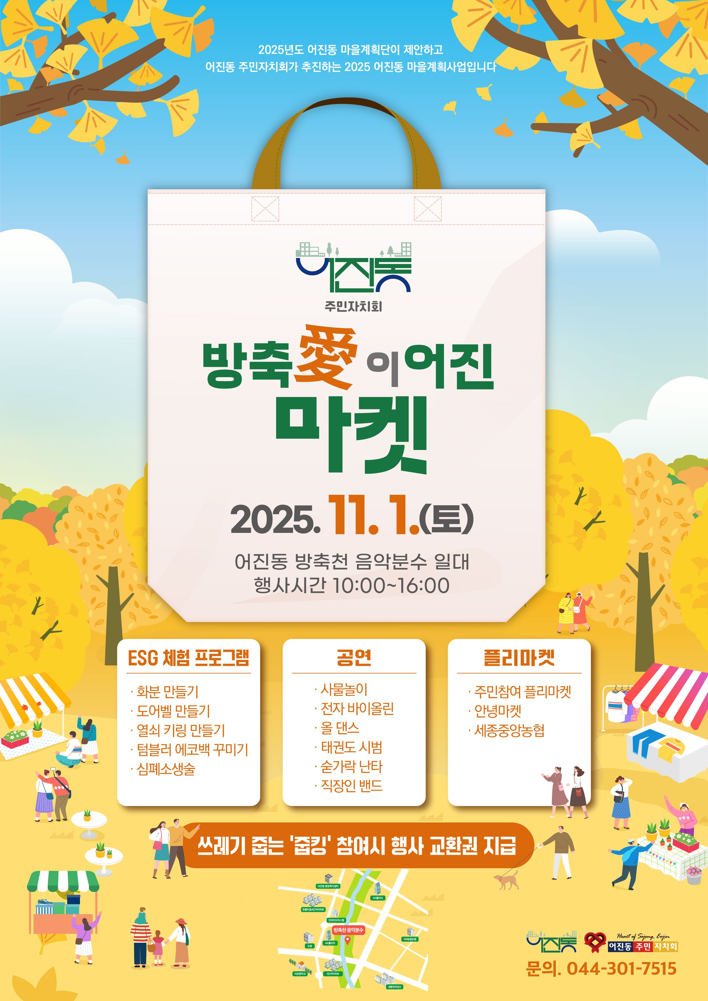 [금요저널] 세종시 어진동이 다음달 1일 오전 10시부터 오후 4시까지 방축천 음악분수 일원에서 어진동 주민자치회와 함께하는 ‘방축애 이어진마켓’을 개최한다.
