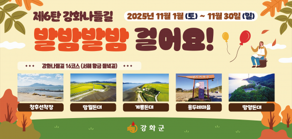 [금요저널] 강화군은 11월 한 달간 올해 마지막 강화나들길 스탬프 챌린지 ‘제6탄 강화나들길 발밤발밤 걸어요’를 진행한다고 밝혔다.
