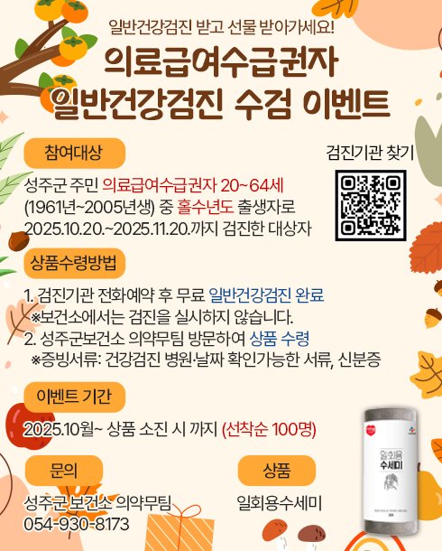 이번 이벤트는 성주군에 거주하는 의료급여수급권자 중 20세에서 64세(1961년~2005년생) 사이의 홀수년도 출생자를 대상으로 진행되며 2025년 10월 20일부터 11월 20일까지 일반건강검진을 받은 대상자가 참여할 수 있다.