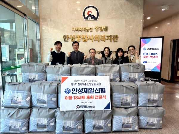 [금요저널] 지난 29일 안성종합사회복지관은 안성제일신협으로부터 ‘2025년 온세상 나눔캠페인’의 일환으로 에너지 취약계층을 위한 겨울용 이불 18채를 후원받았다.