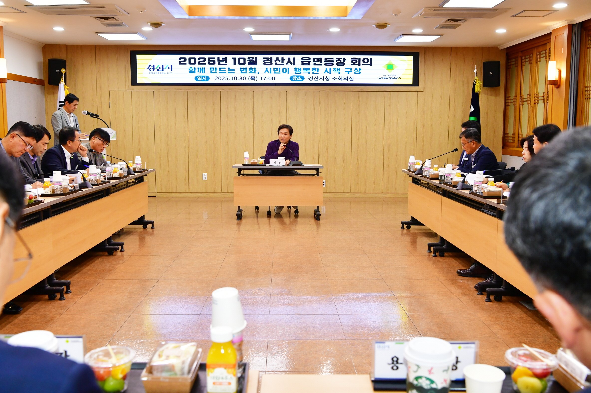 [금요저널] 경산시는 30일 시청 소회의실에서 조현일 시장 주재로 ‘2025년 10월 읍면동장 회의’를 열고 2026년 읍면동 특수 시책 보고 및 현안 사항 협의를 진행했다.