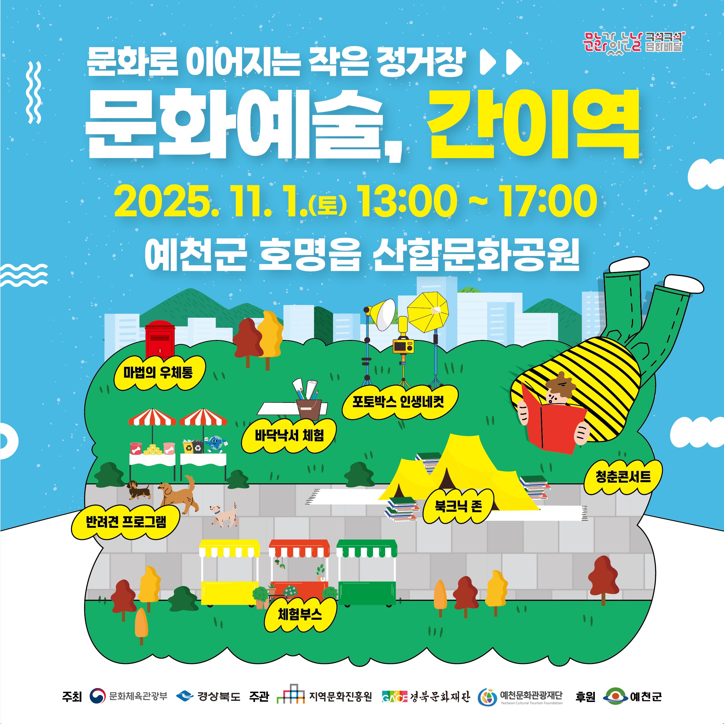 예천 맛고을 장터는 오후 4시부터 오후 9시까지 진행되며 △다양한 공예품과 소품을 판매하는 프리마켓 △다트던지기·동전던지기 등 즐거운 미니게임 △지역 맛집의 대표 메뉴를 즐길 수 있는 먹거리존 △청년 아티스트들의 버스킹 공연 △가을밤을 물들이는 영화 상영 등 다채로운 프로그램이 펼쳐진다.