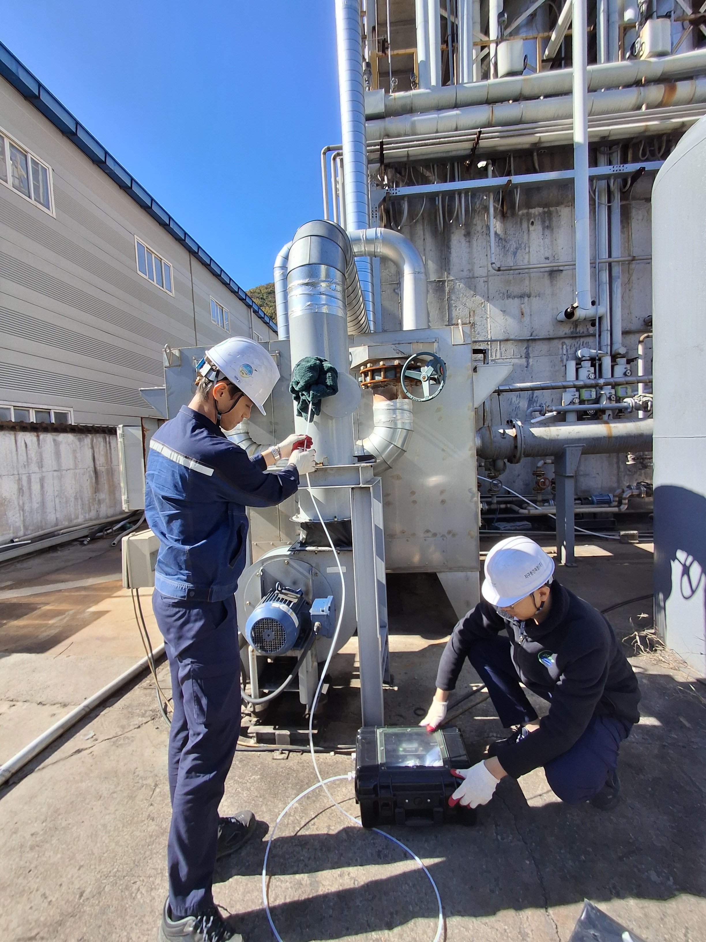 경주시 환경정책과 직원과 민간 환경기술인이 관내 환경배출사업장을 점검하며 대기오염 방지시설의 가동 상태를 확인하고 있다