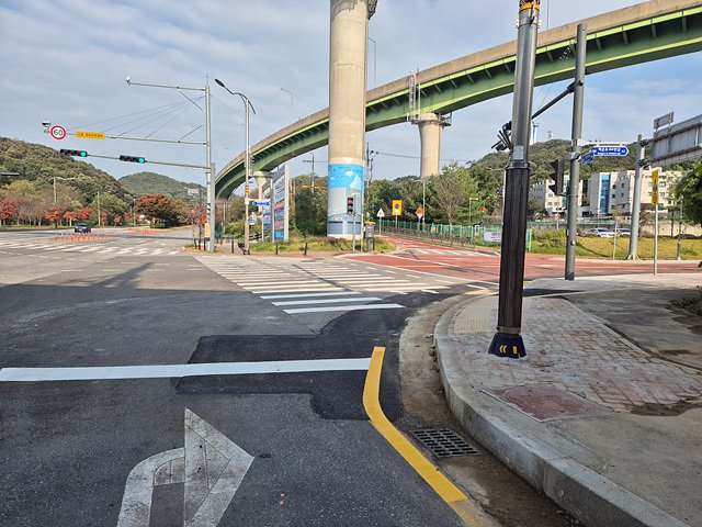 구체적으로 신호등과 가로등을 이설하고 가각부에 있는 보도를 약 1m 축소함으로써, 버스 차량이 진입하는 데 불편함이 없도록 조치했다.
