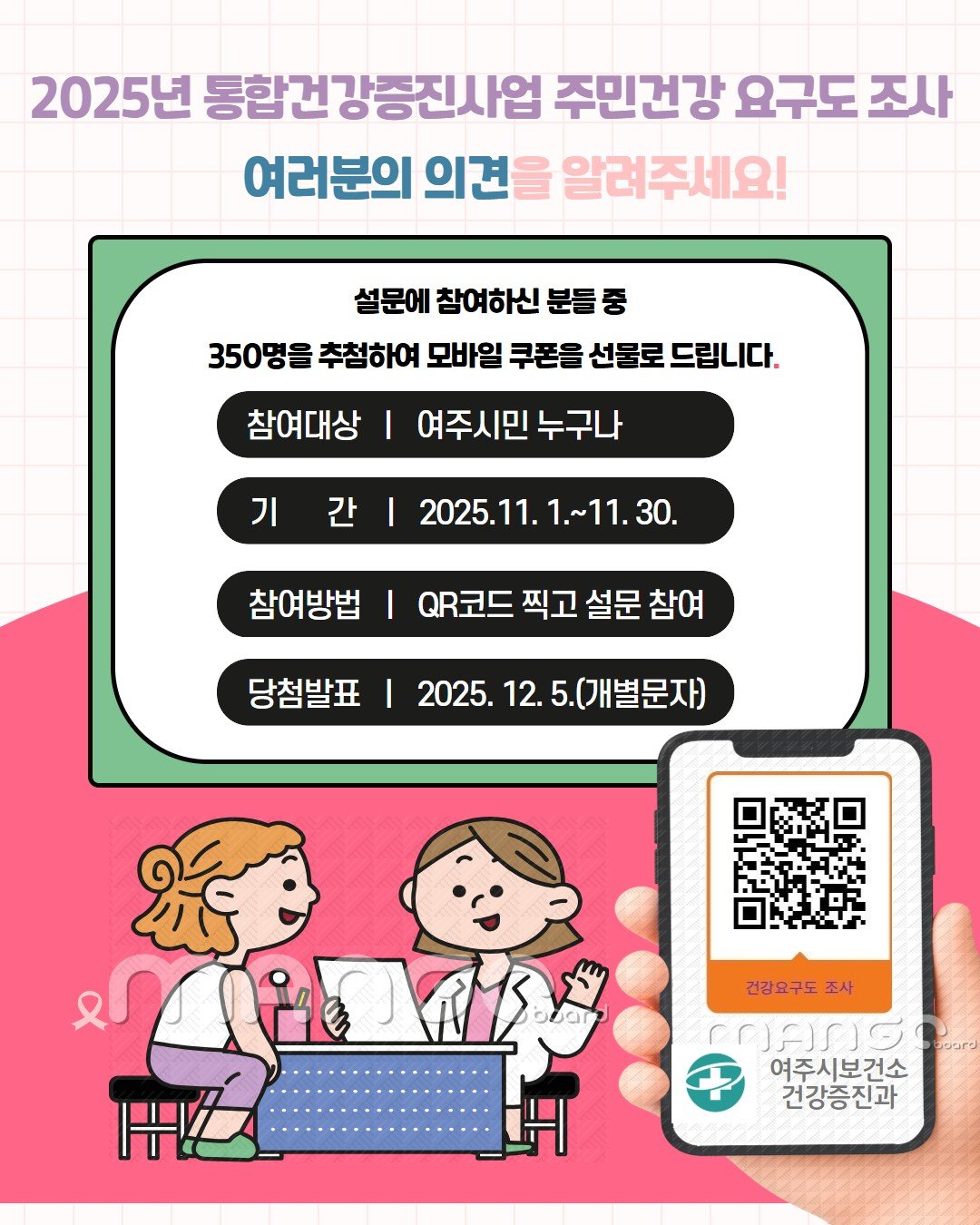 [금요저널] 여주시 보건소 건강증진과에서는 ‘2026년 건강증진사업 계획’수립하고자 시민들을 대상으로 보건의료 서비스에 관한 요구도 조사를 11월 30일까지 진행한다.