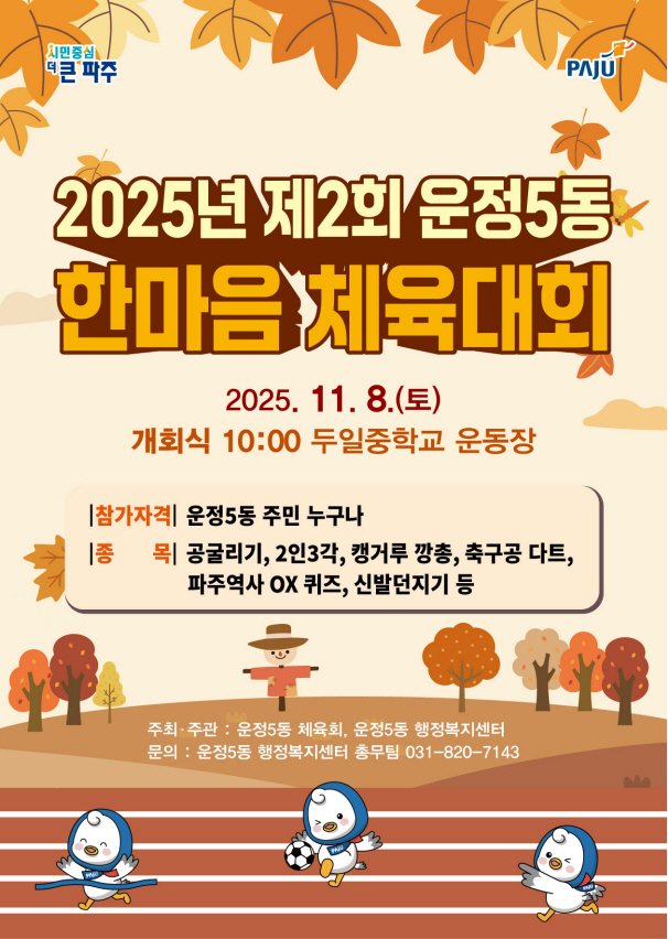 [금요저널] 파주시 운정5동은 오는 11월 8일 토요일 두일중학교에서 ‘2025년 제2회 한마음 체육대회’를 개최한다.