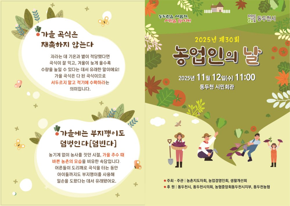 시 관계자는 “이번 행사는 동두천시 농업인이면 누구나 참여할 수 있으며 농업의 소중한 가치를 함께 나누는 자리가 되길 바란다”며 많은 관심과 참여를 당부했다.