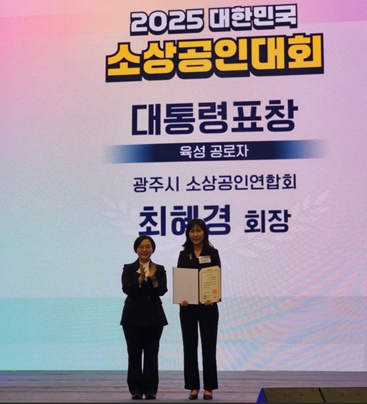 [금요저널] 광주시소상공인연합회 최혜경 회장이 지역 소상공인 육성과 상생 지원에 기여한 공로를 인정받아 ‘2025 대한민국 소상공인대회’에서 대통령 표창을 수상했다.