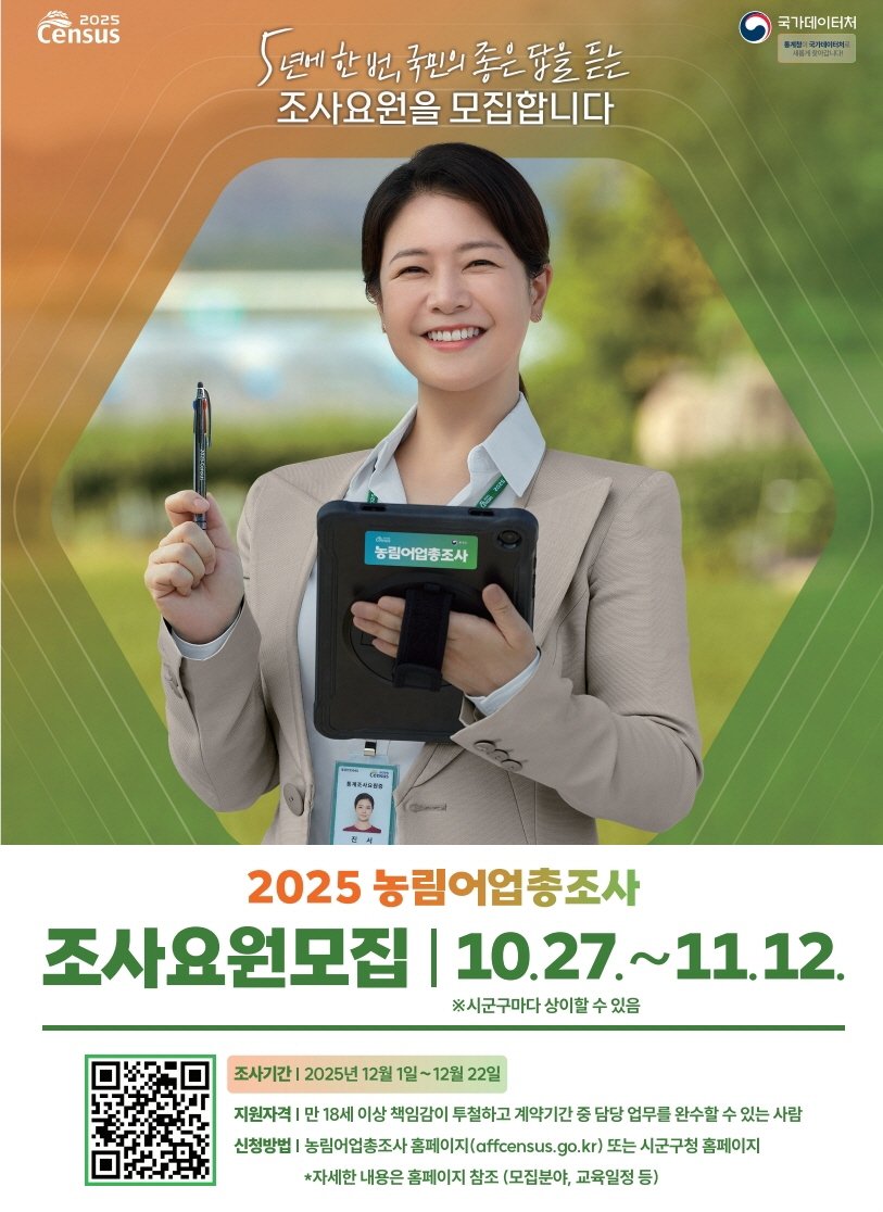 선정된 조사요원 중 조사관리 요원은 11월 24일부터 12월 24일까지, 조사원은 12월 1~22일까지 전국 동시 실시되는 2025 농림어업총조사를 수행하게 된다.