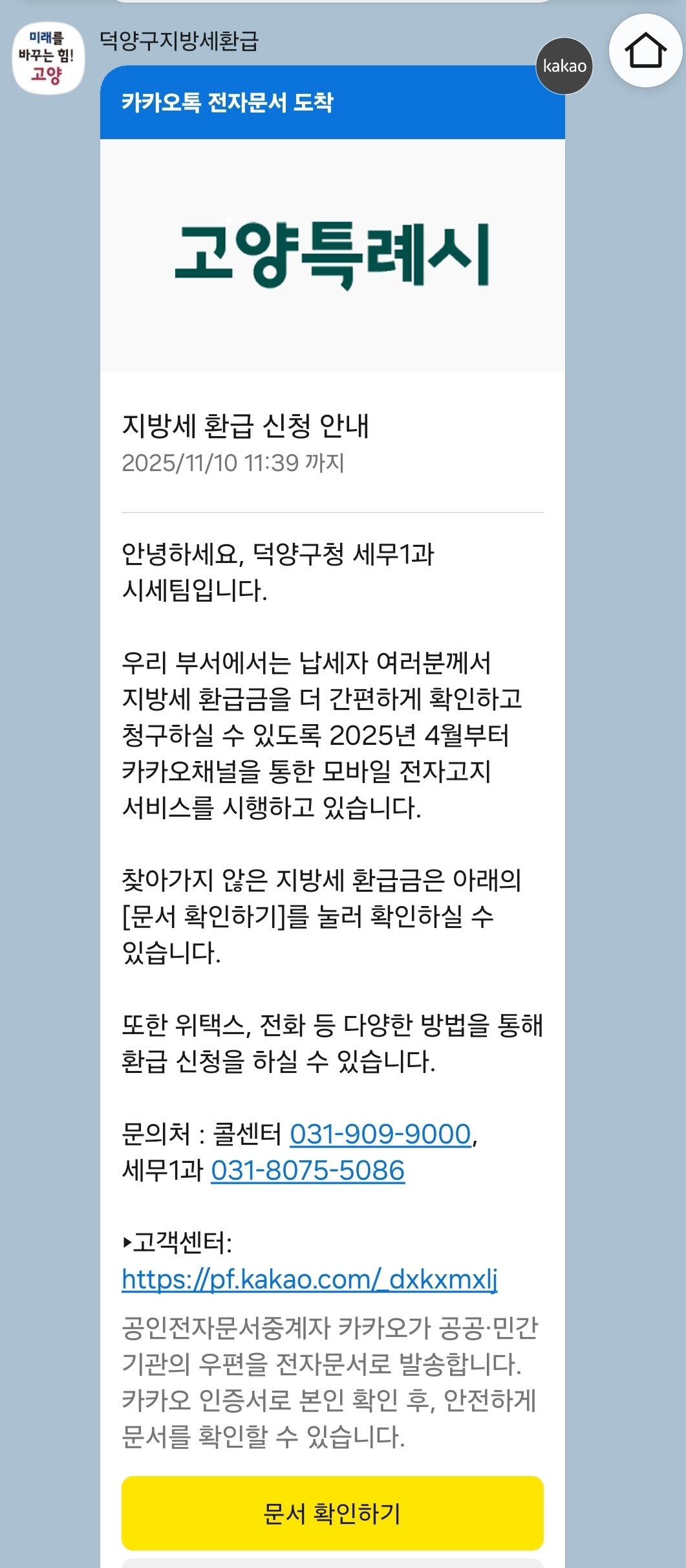 [금요저널] 고양특례시 덕양구는 11월 한 달 동안 납세자가 찾아가지 않은 지방세 미환급금을 돌려주기 위해 ‘지방세 미환급금 집중 기간’을 운영한다고 6일 밝혔다.