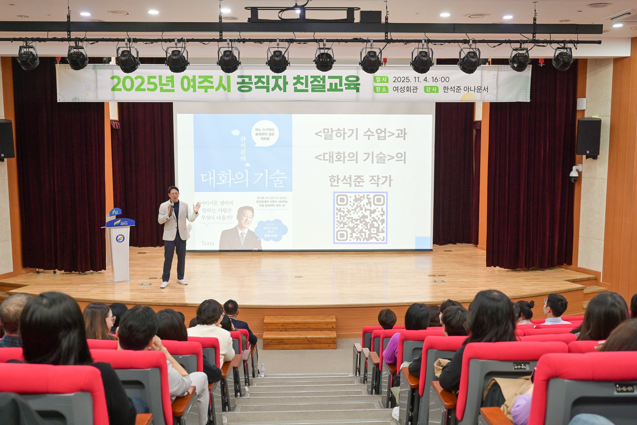 [금요저널] 여주시는 지난 11월 4일 여성회관 공연장에서 친절교육 희망하는 직원들을 대상으로 공직자들의 시대에 부응하는 고객만족 서비스 향상과 민원인과 관계에서 중요한 소통의 기술 향상을 위해 ‘2025년 여주시 공직자 친절교육’을 진행했다.