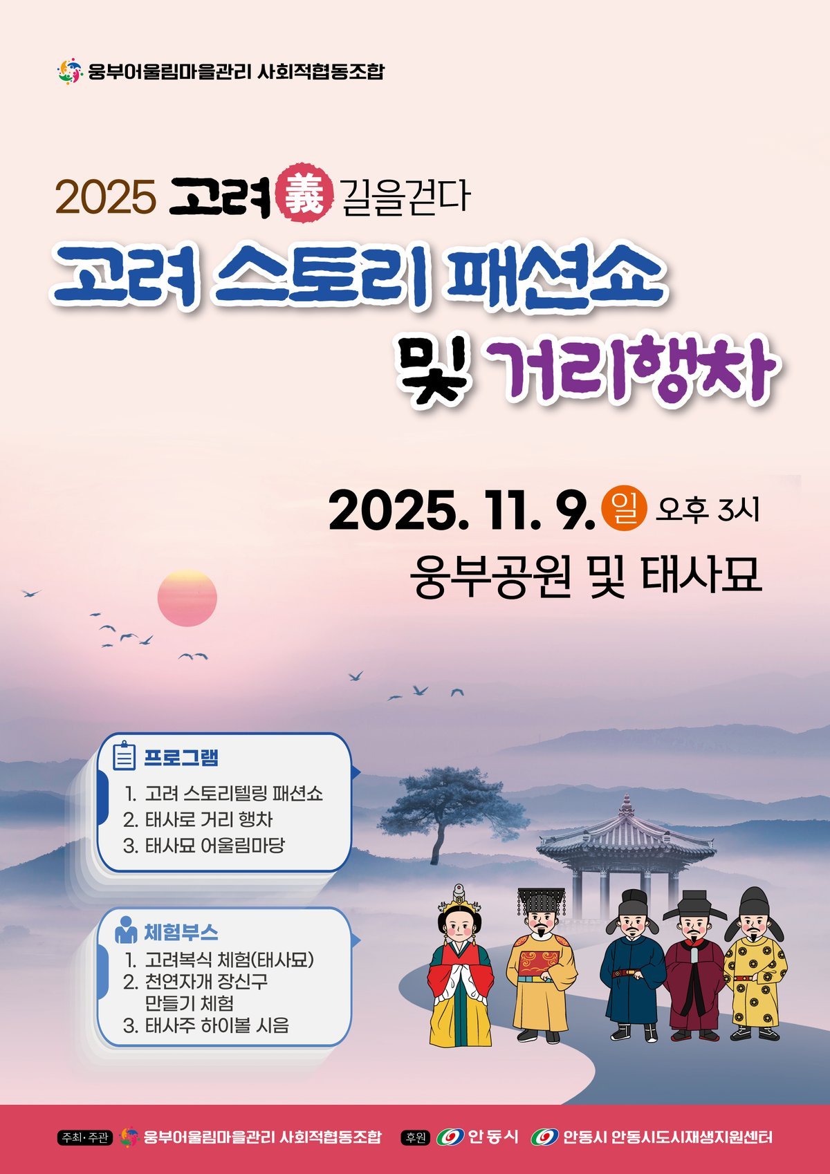 [금요저널] 안동시 중구동 일대를 중심으로 지역 활력 증진과 주민 역량 강화를 위해 활동 중인 웅부어울림마을관리 사회적협동조합이 오는 11월 9일 오후 3시, 안동 웅부공원 일원에서 ‘태사길 마을축제 ‘고려義 길을 걷다’’를 개최한다.