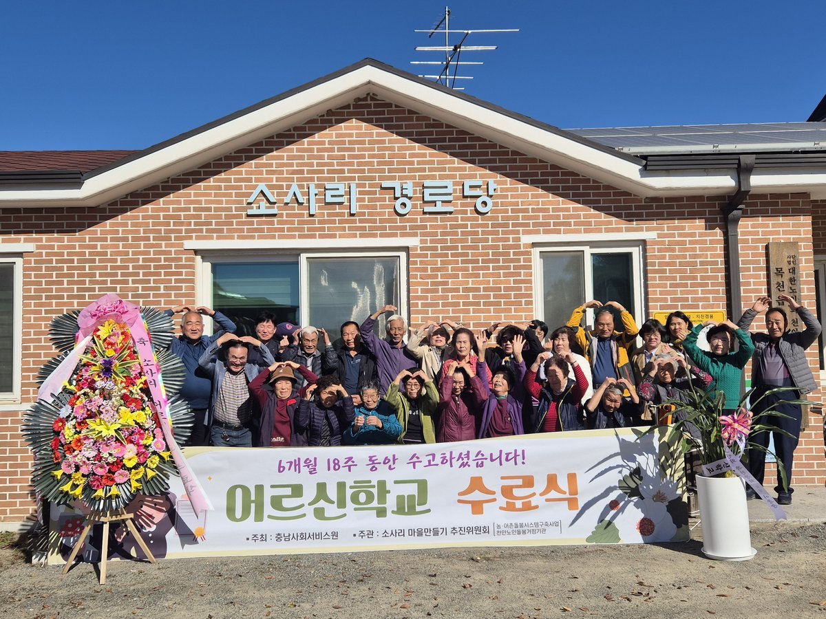 [금요저널] 충남사회서비스원은 11월 10일 소사리마을회관에서 농·어촌 돌봄시스템 구축사업의 일환으로 진행된 천안 목천읍 소사리 어르신학교 수료식을 진행했다.
