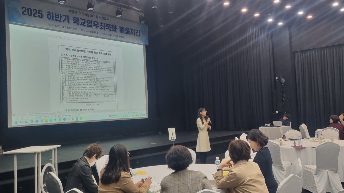 주요 연수 내용은 2025 학교업무최적화 추진방향 및 내용, 업무경감을 위한 실질적인 Tip, 학교업무최적화를 위한 교감의 역할, 직종 간 협력과 갈등 해소, 학교업무최적화 실천을 위한 기본 정보 등 학교 현장에서 적용가능한 다양한 내용으로 구성됐다.