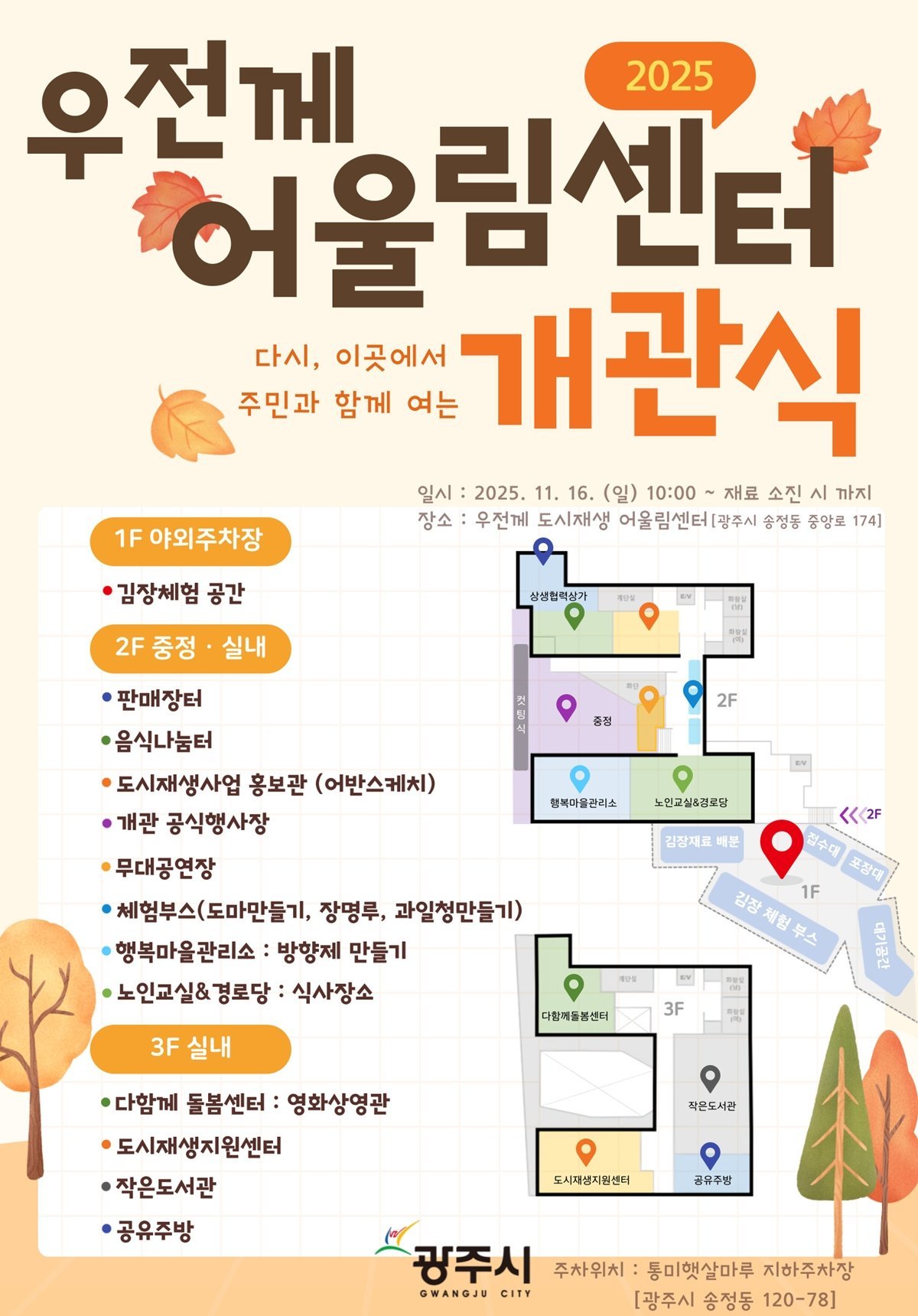 행사는 테이프 커팅식, 시장 기념사, 시설 관람 등의 공식 일정과 더불어, 송정동 지역공동체가 공동 주관하는 ‘우전께 다가치 축제’가 함께 열려 지역 주민과 방문객이 함께 즐기는 축제의 장이 될 전망이다.