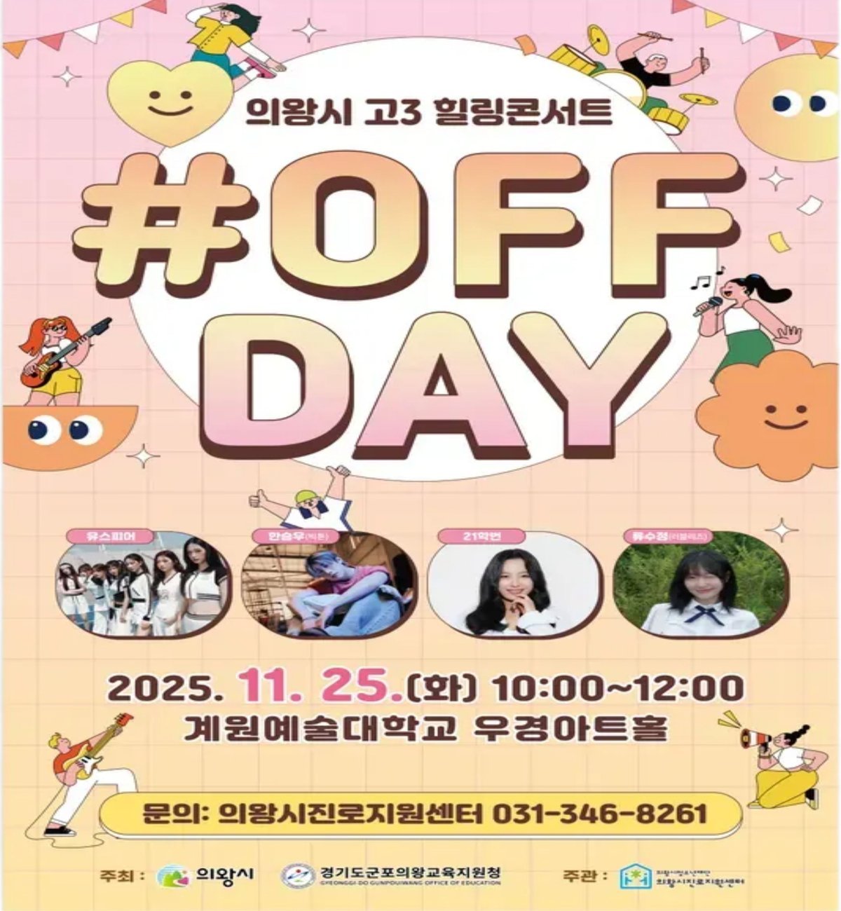 [금요저널] 의왕시청소년재단 산하 의왕시진로지원센터가 11월 25일 계원예술대학교 우경아트홀에서 수능을 마친 고3 청소년들을 위한 힐링 콘서트 ‘#OFF DAY’를 개최한다.