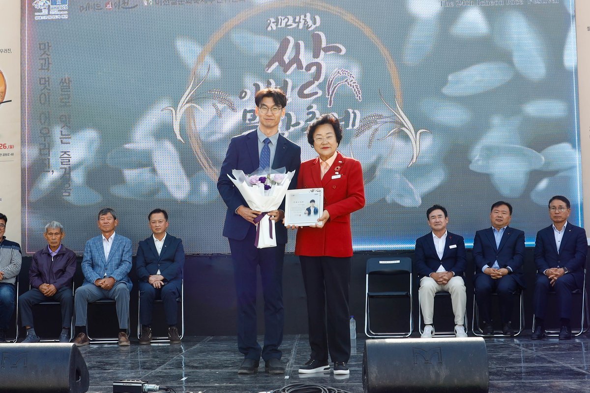[금요저널] 이천시는 지난 10월 23일 이천시 농업테마공원 이천쌀문화축제장에서 열린 ‘2025년 임금님표이천쌀 명인 선발대회’시상식에서 국립식량과학원 현웅조 농업연구관에게 명예시민패와 명예시민증을 수여했다.