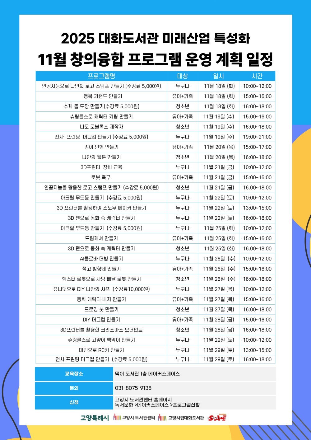 프로그램 신청은 고양시도서관센터 누리집에서汫h 할 수 있으며 자세한 내용은 고양시도서관센터 ’신청/참여 ’메이커스페이스 ’프로그램신청에서 참고하거나 전화로 문의하면 된다.