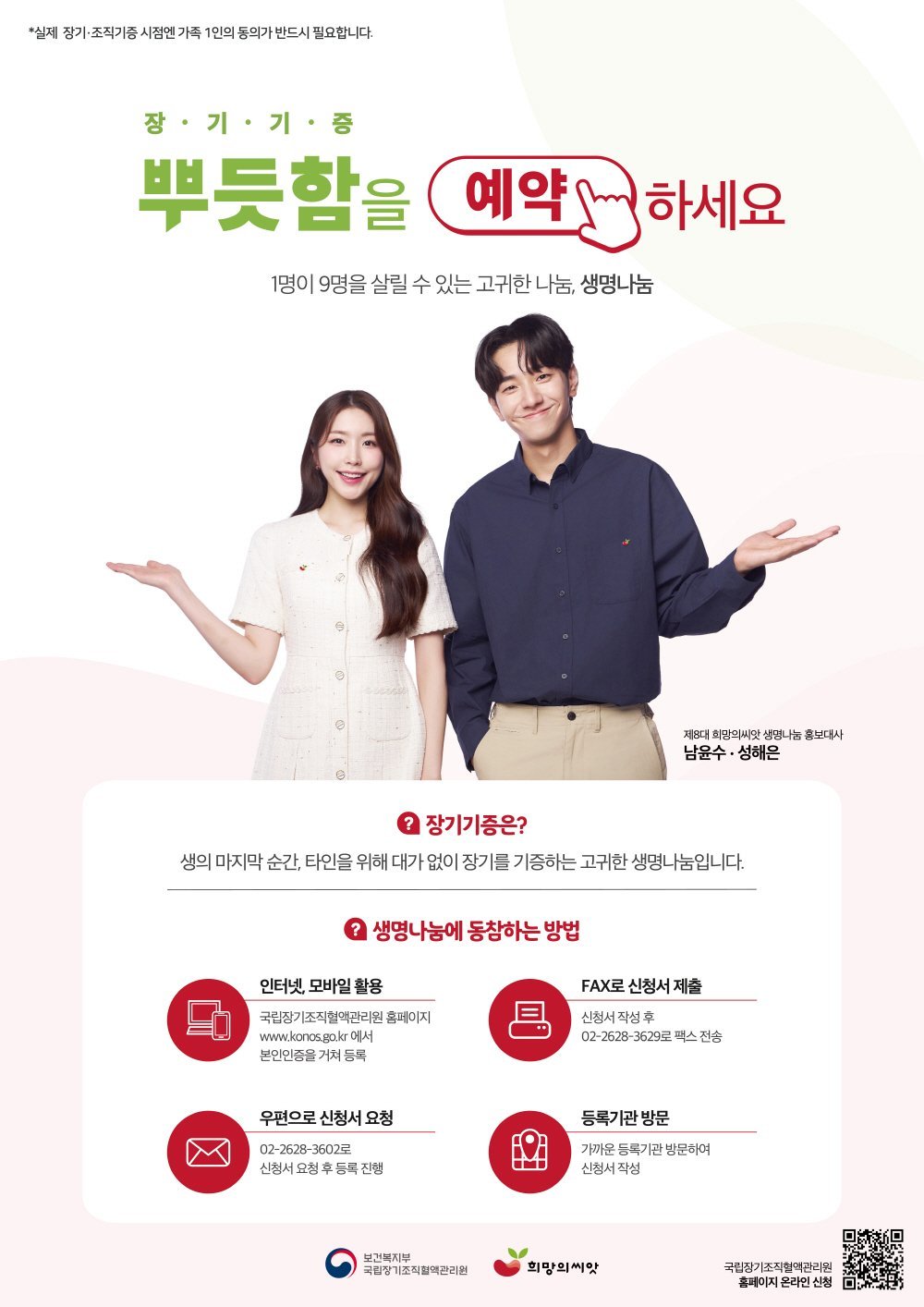 한 사람의 선택으로 장기는 최대 9명, 인체조직은 최대 100명에게 새로운 삶과 희망을 나눌 수 있어, 생명나눔의 의미를 크게 느낄 수 있다.