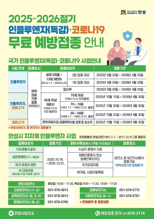 안성시는 “독감은 코로나19와 마찬가지로 호흡기 감염병으로, 동시 유행 시 의료 부담이 커질 수 있다”며 “예방접종이 가장 효과적인 예방법”이라고 강조했다.