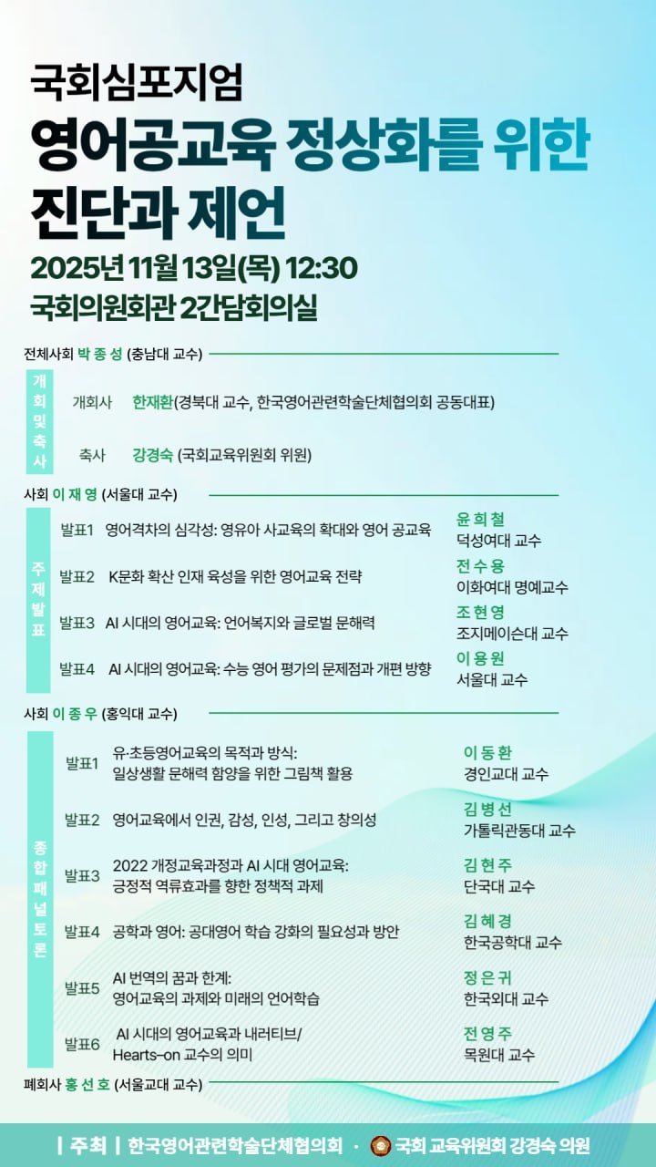 [금요저널] 2025.11.13.국회 교육위원회 소속인 강경숙 의원은 11월 13일 12시 30분, 국회의원회관 2간담회의실에서 ‘영어공교육 정상화와 미래 교육 방향 모색’을 주제로 국회 심포지엄을 개최했다.