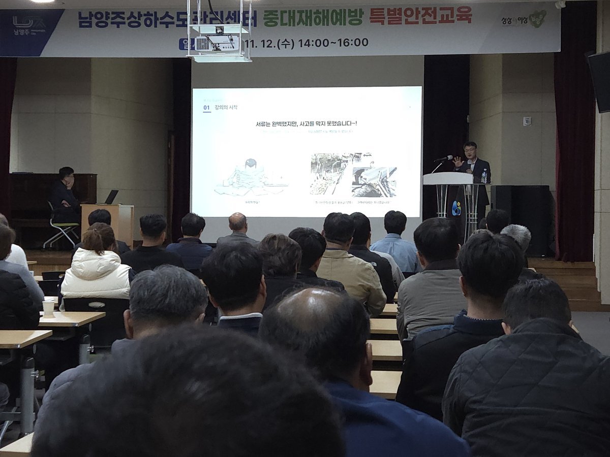 [금요저널] 남양주시는 지난 12일 별내주민자치센터 4층 대강당에서 상하수도관리센터가 직원 및 협력업체 임직원 100여명을 대상으로 ‘중대재해예방 특별안전교육’을 진행했다고 밝혔다.