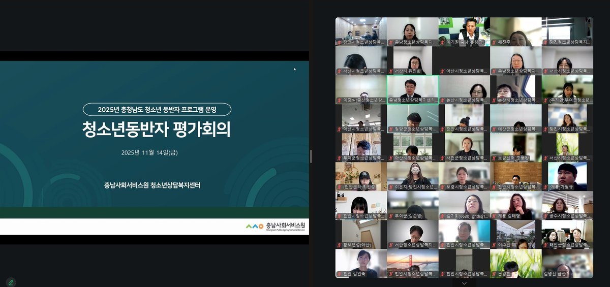 [금요저널] 충남사회서비스원은 11월 14일 충청남도 16개 도, 시·군 청소년상담복지센터 청소년동반자 및 사업담당자 70여명이 모여 2025년 ‘충청남도 청소년동반자 프로그램’평가회의를 비대면으로 개최했다.