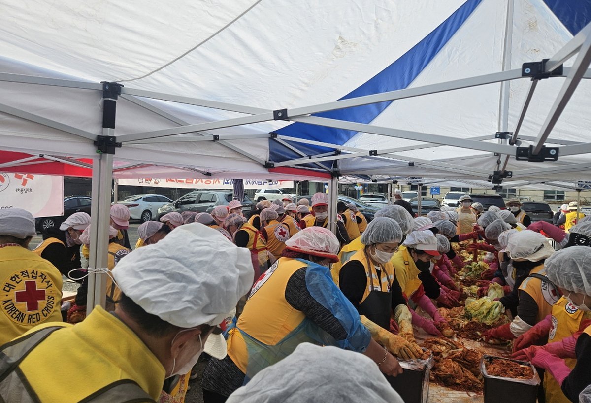 [금요저널] 대한적십자사 시흥시협의회는 지난 11월 13일 ‘사랑의 김장 담기’ 행사를 열고 지역 내 소외된 이웃들에게 온정을 전했다. 이번 행사에는 대한적십자사 시흥시협의회 봉사원 100여 명이 참여해 정성껏 김장김치를 담갔으며, 완성된 김치는 관내 저소득가정 등 약 300가구에 전달됐다.
