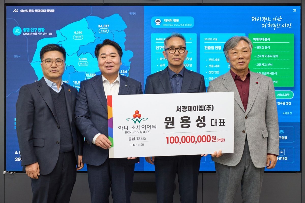 오세현 아산시장은 “서광제이엠 원용성 대표님과 한승은 님의 노블레스 오블리주 실천에 깊이 감사드리며, 기업과 개인이 함께 지역사회를 위해 헌신하는 모습은 우리 지역 나눔 문화의 귀감이 되고 있다”고 말했다.