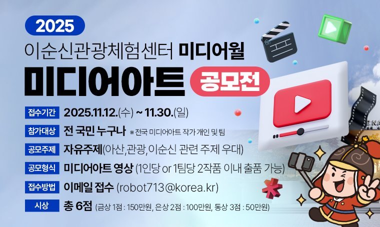 이번 공모전은 11월 30일까지 전국 누구나 참여할 수 있으며, 3480×880 화소 해상도의 미디어아트 영상을 담당자 전자우편로 제출하면 된다. 주제는 자유이나, 아산·관광·이순신 관련 콘텐츠를 우대 선발한다.