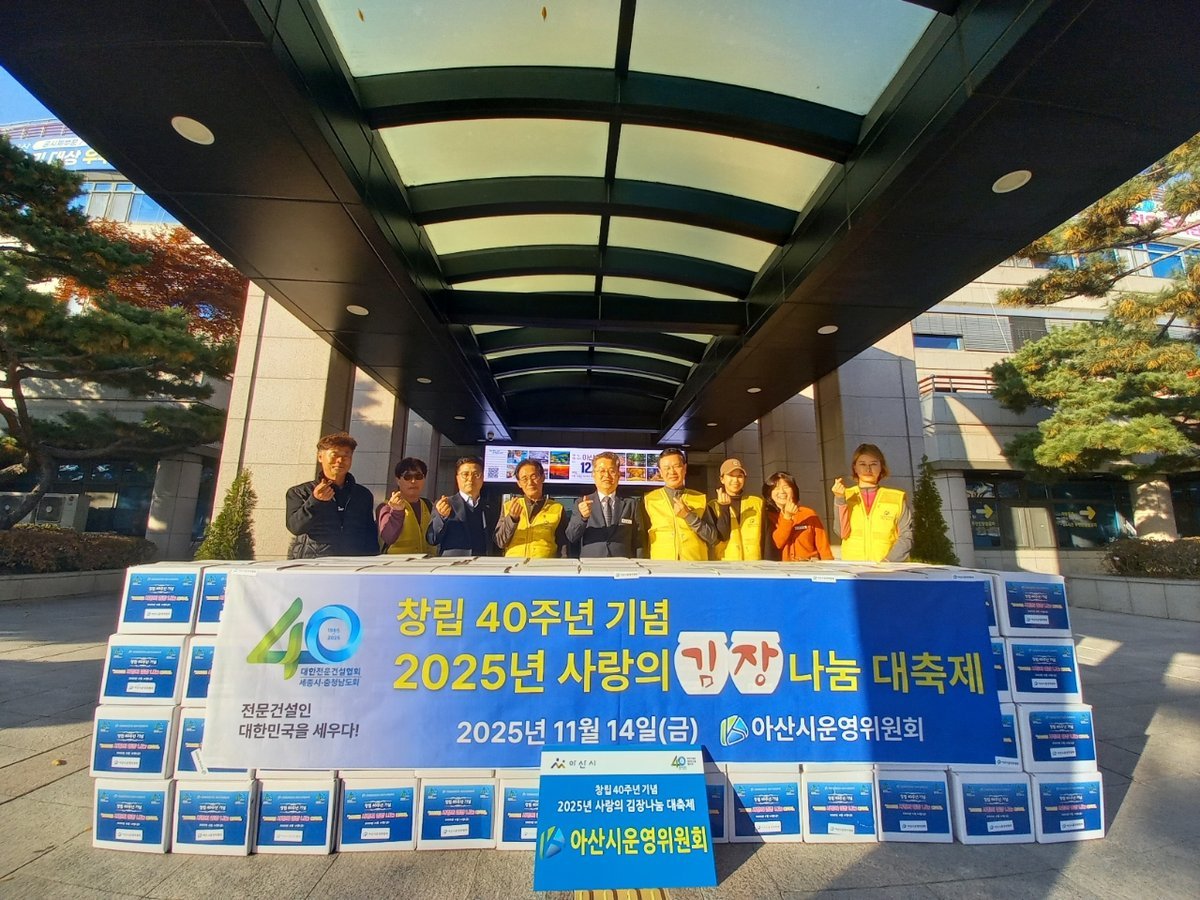 [금요저널] 아산시는 대한전문건설협회 세종시·충청남도회가 협회 창립 40주년을 맞아 14일 세종호수공원중심수변광장에서 ‘사랑의 김장나눔 대축제’를 개최하고, 아산시에 200박스를 기부했다고 밝혔다.
