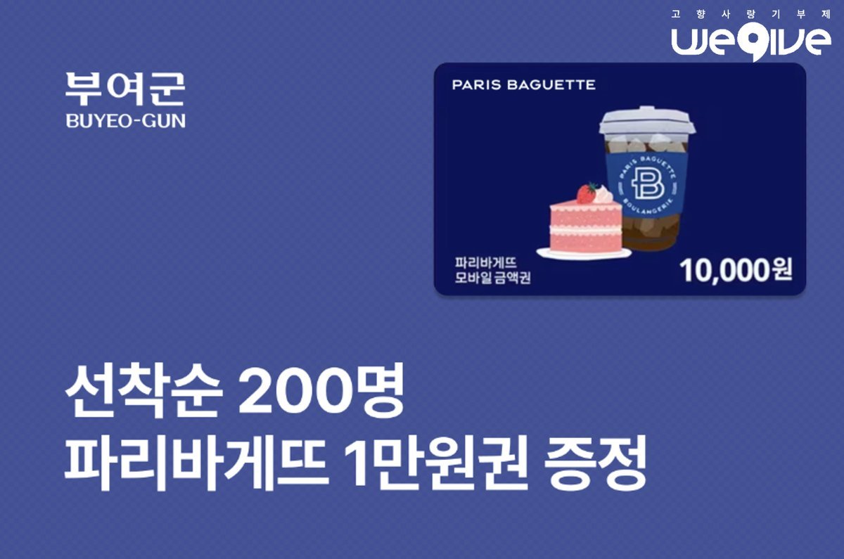이번 이벤트는 고향사랑기부제 제도 확산과 연말 기부 분위기 조성을 위해 마련된 것으로 , 민간 플랫폼 ‘ 위기브 ’를 통해 부여군에 10 만원 이상 기부자 중 선착순 200 명에게 파리바게뜨 기프티콘 을 증정한다.