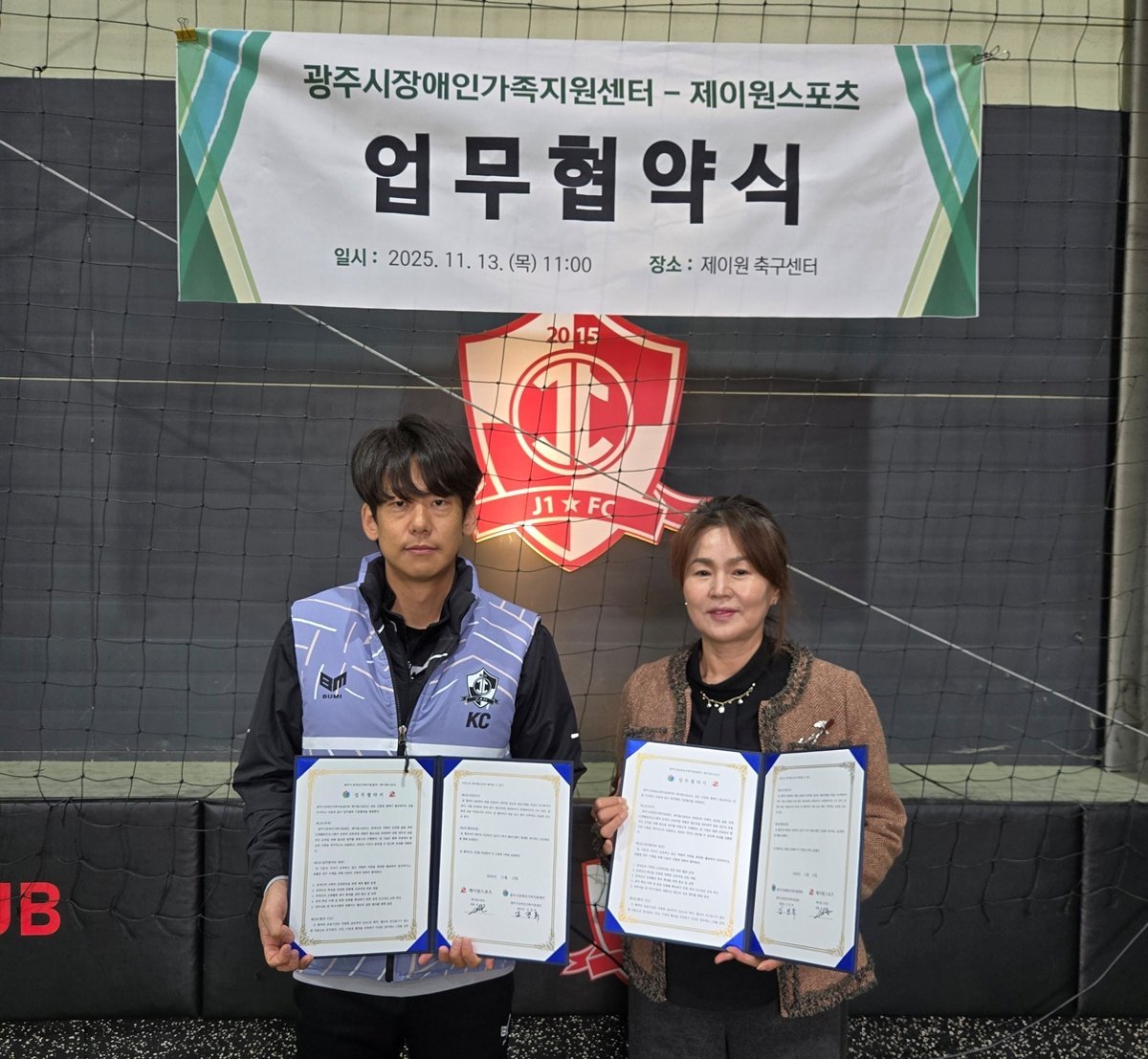 [금요저널] 광주시장애인가족지원센터는 지난 13일 유소년 축구클럽 ‘제이원스포츠’와 ‘발달장애인의 신체활동 지원 및 가족 여가 활동 확대를 위한 업무협약’을 체결했다.