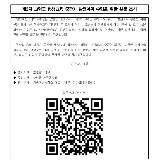 설문조사는 온라인과 오프라인을 통해 진행되며 고령군 평생교육포털을 통해 참여할 수 있다.