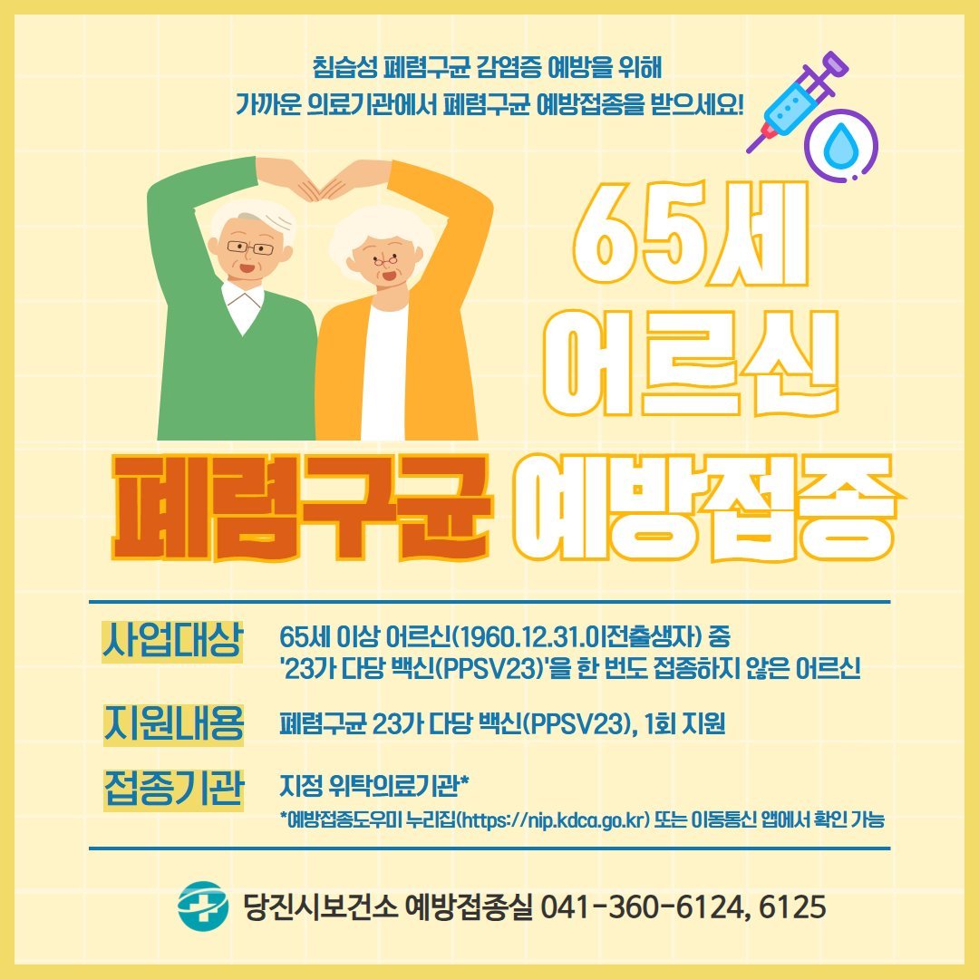 [금요저널] 당진시보건소는 침습성 폐렴구균 감염증을 예방하기 위해 65세 이상 어르신을 대상으로 폐렴구균 백신을 무료 접종한다고 19일 밝혔다.