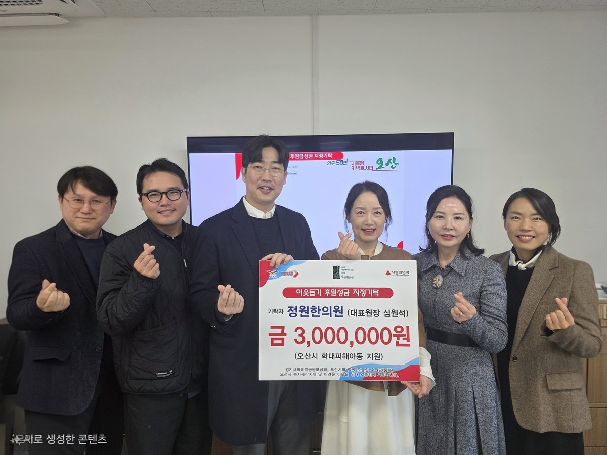 [금요저널] 오산시는 정원한의원이 지난 18일 관내 학대피해아동 지원을 위해 지정후원금 300만원을 기탁했다고 밝혔다.